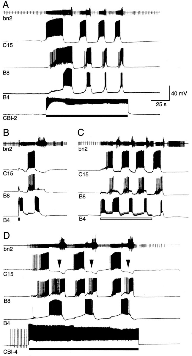 Central Pattern GeneratorsAn entirely different kind of rhythm can be generated inside individual neurons. Such endogenous rhythms typically involve voltage dependent calcium channels, although other arrangements are possible. The figure shows an endogenous bursting rhythm in a pacemaker neuron from a central pattern generator.