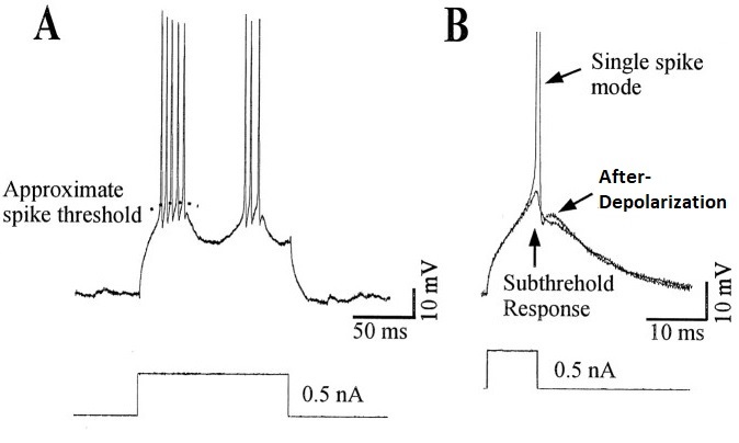 If we take the waveform in (b) and expand it, we can see individual action potentials, as well as the underlying membrane potential. Bursting can also be elicited electrically, by applying small intracellular current pulses. This particular neuron from the visual cortex, spikes at 71 Hz.