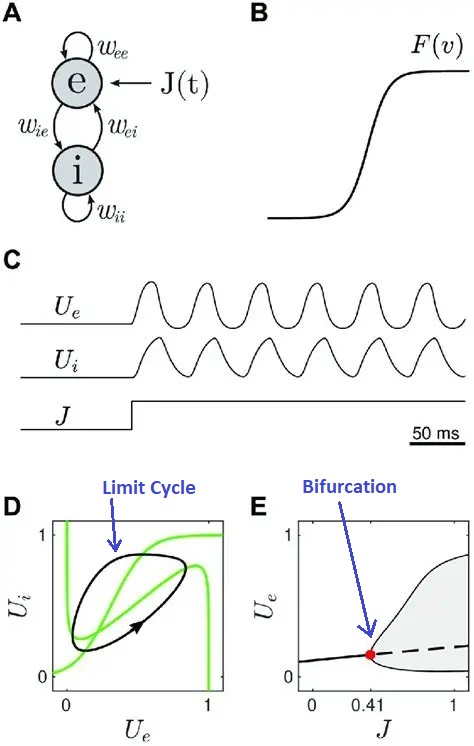The behavior of the Wilson-Cowan model in phase space is shown in the diagram below. Whenever the trajectory enters the limit cycle orbit (the black line in part D of the figure), oscillatory behavior (brain "waves") will be observed in the population. This diagram shows an explicit input J that drives the excitatory population. In this case, the behavior depends on the strength of the input. At very low strength, the network may not oscillate and its response may be an exponential decay back to baseline. However a stronger input may cause the network to change state, shifting into an oscillatory output pattern. The next figure shows two different kinds of trajectories that can be observed in such a system, figure D shows a limit cycle and figure E shows a bifurcation. The bifurcation is important because it is the point at which the system changes state (changes "phase" as it were, although that word is now being used in a different context). The phase transition at a bifurcation point leading to a limit cycle is reminiscent of the action potential, but in this case entire population of neurons is being influenced by the dynamic.