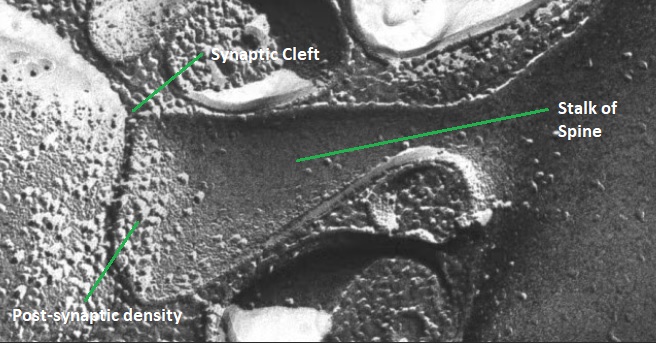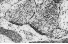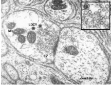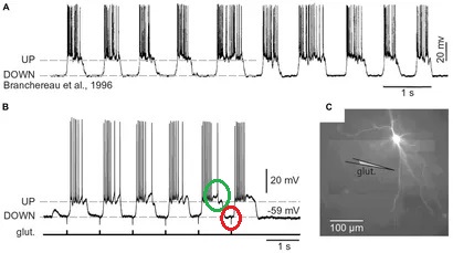 Synapses modify the neuronal membrane potential. The strength and time course of synaptic influence, together with the internal membrane properties of the neuron, ultimately determine the "spike times" of action potentials. Some neurons don't use action potentials, instead they transmit graded responses along their membranes, but these neurons can still be influenced synaptically. The word "synapse" in a general sense is meant to include all forms of local connectivity, for example gap junctions, but historically it refers specifically to a vesicular form of transmission.Vesicular TransmissionThe classic synapse is unidirectional, from an axon terminal to the dendrite of another neuron. The presynaptic axon terminal is filled with vesicles containing neurotransmitter, which diffuse across the synaptic cleft to interact with receptors on the postsynaptic side. Synapses can be made anywhere, on the dendrites, on the cell body, even on other axons. There are many specialized kinds of synapses in a human brain, for instance the glomeruli in the cerebellum. The first figure below stylizes an oversimplified "typical" synapse, showing the release of neurotransmitter from synaptic vesicles. The second figure shows the fusion of transmitter-loaded vesicles with the axon terminal, and the expulsion of neurotransmitter into the synaptic cleft. Fusion of vesicles with the presynaptic membrane depends on calcium, which enters the axon terminal during an action potential. When calcium enters the synapse, it causes the vesicles to fuse with the presynaptic membrane, releasing their contents into the synaptic cleft, which is a tiny gap between the pre- and post-synaptic membranes maintained by specific protein scaffolding. After release from the vesicles, the neurotransmitter diffuses across the cleft and binds with receptors on the postsynaptic side. After it's done binding, it can be either degraded or recycled (and either process may involve active reuptake, into neurons and/or glial cells - the reuptake is accomplished by specialized proteins called "transporters").![]() ![]() Neurotransmitter filled vesicles are synthesized and packaged in the cell body, and transmitted down the axon to the synaptic terminals by a network of microtubules related to the cytoskeleton. This process is regulated, it can be sped up or slowed down according to demand. There is both anterograde transport and retrograde transport, used vesicles are transported back to the cell body where they can be refilled. In conditions of changing demand, the quantal transmission hypothesis specifies that the amount of neurotransmitter per vesicle remains relatively constant, but the number of available vesicles can change. In the figure below MTOC is a microtubule organizing center.![]() The totality of the synapses emanating from a neuron may be quite diverse. Some neurons use more than one transmitter. The axons branch and send collaterals all over the brain, and in some areas the receptors may be different and have unique postsynaptic effects. However in most neurons, the branching patterns are very specific, and in some cases very local. In the cerebral cortex for example, the axons of lower layer cells may turn upward and branch to synapse within a narrow cylinder about equivalent in width to a mini-column. ![]() ![]() ![]() Spiny synapses are ubiquitous in the human brain. Here they are in the hippocampus and cerebral cortex, and they occur as well in the basal ganglia and cerebellum and many other subcortical structures.![]() ![]() The synaptic spines are important for many reasons. One of the most important is isolation, which is necessary for synapses to be updated independently. Another reason is that each patch of spiny membrane can sustain independent subthreshold membrane oscillations. In effect, each spine can become its own oscillator, coupled to others by conductances along the membrane, but only weakly and controllably coupled because of the high impedance of the spine stalk and its biochemical compartmentation relative to the rest of the dendrite. We will revisit this scenario in more detail later, when we talk about the behavior of coupled oscillators. Below is the bursting behavior of a pyramidal neuron in the cerebral cortex, elicited by applying glutamate to the basal dendritic tree. You can see the small subthreshold membrane oscillations that occur even in the down state. These are often related to membrane resonances which in turn depend on the conductances and are therefore synaptically modifiable. Changes in the membrane time constant are one way to control the interval between spikes.![]() Synaptic activity results in excitatory and inhibitory postsynaptic currents. The time course of such currents could be anywhere from a millisecond to a second or more, depending on the kinetics of the underlying neurotransmission. There is typically a small delay associated with synaptic transmission, perhaps on the order of a millisecond or so. ![]() The effect of incoming EPSP's may change when the postsynaptic membrane is driven into a more excitable state. This is especially true for multistable neurons that have a judicious combination of conductances that allow them to maintain multiple resting potentials depending on the time course of activity. For instance there are "plateau potentials" that are larger than ordinary EPSP's, and these are thought to be created by calcium conductances in the dendrites. The plateau potentials can put the neuron cell body into a different resting state, where it responds differently to incoming synaptic signals. Below are some of the plateau potentials related to dendritic spiking activity in neostriatal medium spiny cells. The plateau potentials typically result in bursts of spiking. They are compared with ordinary EPSPs that may result in one or a few spikes. Plateau potentials are different from dendritic spikes. They represent a stable equilibrium state of the neuronal membrane,