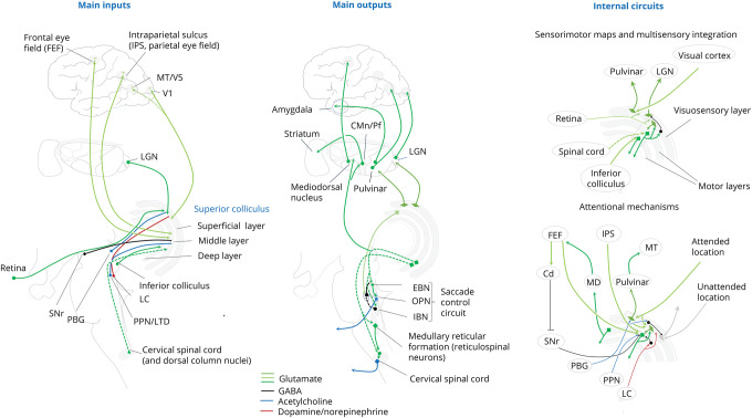 The organization of the oculomotor system in the cerebral cortex can best be understood by examining its connections with the superior colliculus. In humans, the superficial layers of the SC are linked primarily with the visual cortex and posterior thalamus, receiving inputs from almost the entire visual cortex, area LIP in the parietal cortex, and the frontal eye fields. The intermediate layers connect with the auditory and somatosensory cortex and the posterior parietal cortex, and receive inputs from the parietal and frontal eye fields. The deep layers connect primarily with the brainstem and the cerebellum, and send corollary discharge information to the frontal eye fields. (Diano et al 2025)