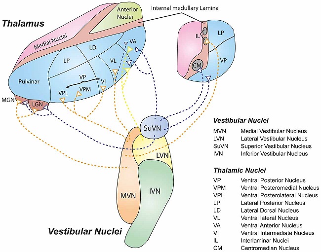 The organization of the vestibular nucleus is shown in the figure. There are four sub-nuclei, called inferior, medial, lateral, and superior. (The lateral subdivision is also called Deiter's nucleus, and the superior subdivision is also called the nucleus of Bechterew, while the inferior subdivision is sometimes referred to as the descending vestibular nucleus or the nucleus of Roller). The main projections of these areas are to the spinal cord (mostly reflexes), to the oculomotor nuclei (for eye movements), to the thalamus (VPi) for perception, and to the cerebellum (for coordination of posture). The medial vestibular nucleus (MVN) is the one that connects with the nucleus prepositus hypoglossi (NPH). It forms an essential part of the oculomotor integrator.