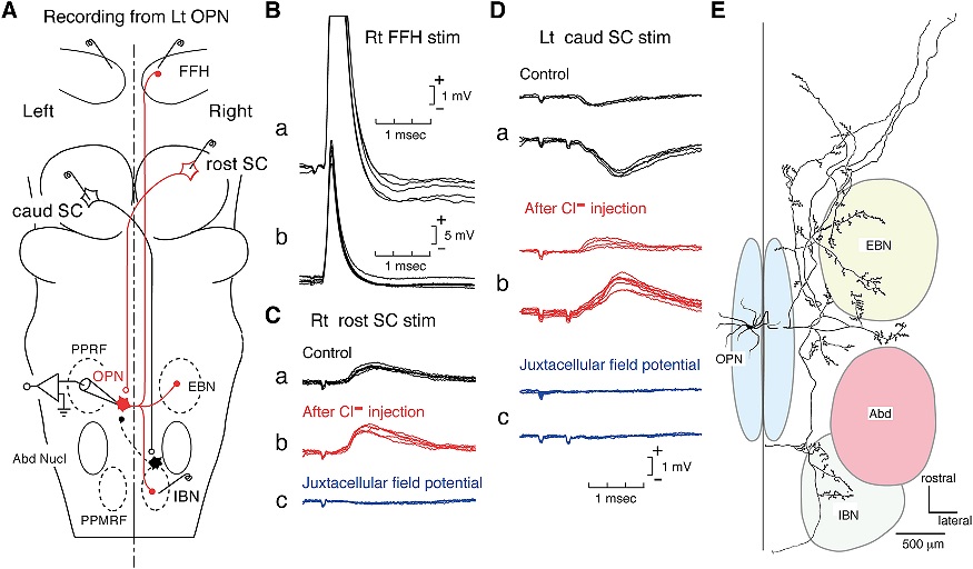 The oculomotor nuclei are organized in the brainstem, at and below the level of the superior colliculus. The general plan is that the abducens and trochlear muscles (lateral rectus and superior oblique, respectively) have their own dedicated nuclei, while the oculomotor nucleus handles the other four muscles. The figure shows the general organization of the oculomotor structures in the brainstem.![]() (figure from Sanchez & Rowe 2018) The abducens nucleus controls the lateral rectus muscle, which pulls the eye to the side, away from the midline. This is the most important muscle for horizontal saccadic eye movements. In addition to projecting to the muscles themselves, neurons from the abducens nucleus send axons across the midline to the contralateral oculomotor nucleus, that control the medial rectus muscle in the opposite eye, to keep the eyes in sync. There are also some projections into the floccular region of the cerebellum, and these could perhaps carry a copy of the oculomotor commands for subsequent processing. Motor NeuronsThe motor neurons for the lateral rectus muscle are located in the abducens nucleus (the axons travel in cranial nerve VI, the abducens nerve). Those for the superior oblique muscle are located in the trochlear nucleus (the axons travel in cranial nerve IV, the trochlear nerve). The remaining eye muscles are handled by various subdivisions of the oculomotor nucleus (with axons traveling in cranial nerve III, the oculomotor nerve). The figure shows the subdivisions of the oculomotor nucleus.![]() The oculomotor neurons are fast. The figure shows the firing of an abducens motor neuron relative to muscle tension and eye position. Note that the instantaneous firing rate of the motor neuron closely resembles the tension in the eye muscle. However this tension adapts very quickly to eye position, as shown in the top trace. The majority of the saccade-related motor neurons in the adbucens nucleus supply fast twitchy muscle fibers in the lateral rectus muscle. There is also another distinct group of abducens motor neurons that are slighly slower and drive multiply innervated muscle fibers that are more closely related to fixation.![]() (figure from Lopez-Carrizosa et al 2011) There are four types of neurons in the abducens nucleus, identified by chemical means (Horn et al 2018). Two of them innervate the slow (multiply innervated MIF) and fast (singly innervated SIF) muscle fibers of the lateral rectus muscle. These neurons are both cholinergic. A third type, an interneuron, crosses the midline to connect with the contralateral oculomotor nucleus via the medial longitudinal fasciculus. It is not cholinergic. These interneurons get inputs from the same set of PPRF premotor burst neurons as the abducens motor neurons themselves, including the integrators in the NPH and MVN, and the pause neurons in the NRI (please refer to the glossary for a review of these terms). The abducens interneurons drive the contralateral eye for conjugate eye movements. A fourth group of AChE-positive (but ChAT-negative) neurons, located rostrally and near the midline, connects with the flocculus and ventral paraflocculus of the cerebellum via the paramedian tract. These PMT neurons contribute to gaze holding. The SIF neurons are clustered in the middle of the adbucens nucleus, and the MIF neurons form a shell around them. The PMT neurons form a rostral cap on the entire structure.The palisade endings on the eye muscles are an anomaly. Early research in cats and monkeys indicated they're cholinergic and originate from the motor neurons themselves, but later research seems to point to a small separate cell group within the motor neuron population. The palisade endings are anomalous because the fast twitchy SIFs in monkeys exhibit the classical en plaque endings near their midpoints, and the MIFs show small en grappe endings that are distributed along the whole length of the muscle fiber (Spencer and Porter 2006). The palisade endings may serve a motor related role, but it is equally likely they somehow deliver proprioceptive information back into the oculomotor system. The figures shows some palisade endings on a lateral rectus muscle.![]() (figure from Streicher et al 2022) In addition to the oculomotor neurons themselves, there are motor neurons responsible for contracting the pupil, accommodating the lens, and raising the eyelid. Pupil constriction is a parasympathetic response driven from the nucleus of Edinger-Westphal. There is a light-based reflex originating in the retina, fibers from retinal ganglion cells travel through the optic chiasm and optic tract before entering the pretectal nucleus (specifically the subdivision called the pretectal olivary nucleus), and from there the neurons connect with Edinger-Westphal, which sends preganglionic fibers to the ciliary ganglion, which in turn sends postganglionic fibers to the sphincter pupillae (a circular muscle in the iris), causing the pupil to constrict (Akova et al 2025). The pretectal nuclei drive the nuclei of Edinger-Westphal bilaterally, so a light stimulus in one eye will cause both pupils to constrict. These pathways are shown in the figures.![]() ![]() The lens accommodation pathway drives the ciliary muscles. These muscles contract for near objects (causing the lens to become thicker and more spherical, increasing its refractive power), and relax for distant objects. Lens accommodation is a parasympathetic response. There is an accommodation reflex that includes the pupil and medial rectus muscles as well as the ciliary muscle. These three components are called the "near triad", as accommodation usually includes ocular convergence (an inward movement of both eyes), and miosis (pupil constriction to increase the depth of focus). Since lens accommodation is related to depth perception, there are control signals issued from cerebral area 19 (V3) that travel to the pretectal area and then to the nucleus of Edinger-Westphal, which s