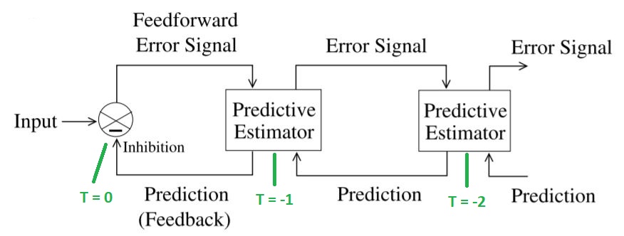 Since its popularization in the insightful paper by (Rao and Ballard) the mechanisms around predictive coding have been extended by researchers like Karl Friston, who introduced the concepts of free energy and complexity into the basic paradigm. Free energy, in a neural network, is an indicator of surprisal. It has terms related to errors relative to previous predictions, and complexity related to the simplest possible description of the input.