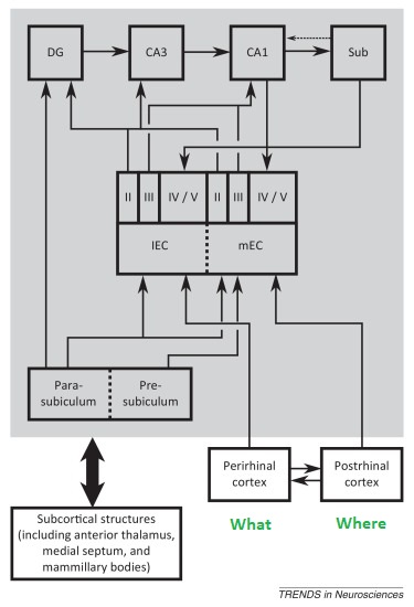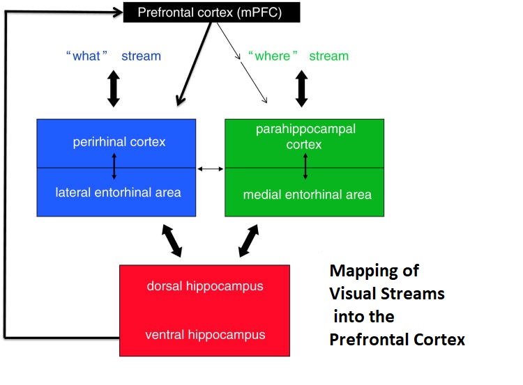 Fibers from the "where" visual pathway enter the parahippocampal cortex and connect with the medial entorhinal cortex. Fibers from the "what" visual pathway enter the perirhinal cortex and connect with the lateral entorhinal cortex. Fibers from both lateral and medial entorhinal pathways enter the hippocampus, where they remain segregated and connect in distinct manners. Parts of the hippocampus then connect with the prefrontal cortex through several pathways, some direct and some indirect, via the subiculum and other nearby structures.