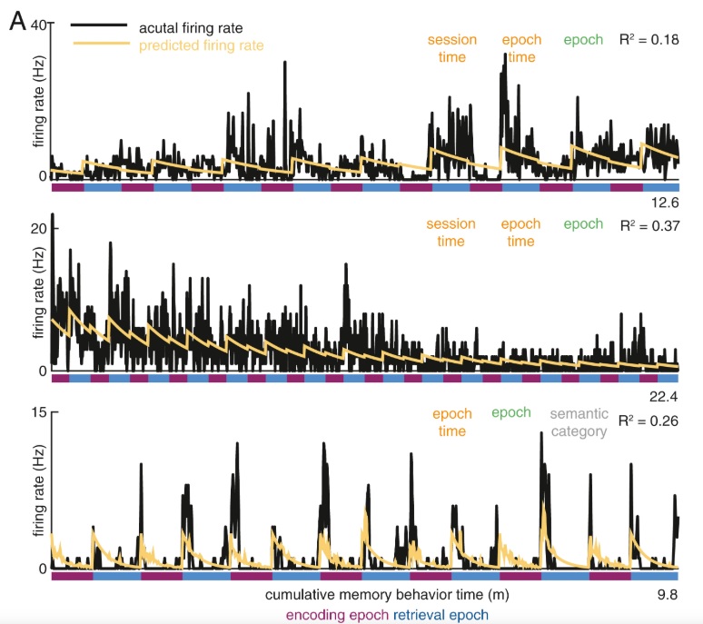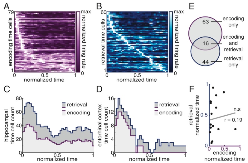In principle, phase encoding is straightforward. It is a particular form of the "phase modulation" used in communications systems. This form of modulation is often deemed to be superior to amplitude and frequency modulation, in that it is computationally efficient and noise resistant. However radio engineers are keenly aware of the issues in encoding and decoding. In the radio context, decoding phase-encoded information requires complex circuitry (usually handled with phase locked loops). In a neural context, things are a little more forgiving. Phase encoding can in theory occur on a local basis, and again "in theory" the precise form of the encoding waveform need not be used to recover the original signal. The key part of the information that is actually being encoded in the brain, is relative positioning. And this can occur along either spatial or temporal dimensions, or both. In a place cell in the hippocampus, the phase of firing represents the position within the receptive field. In a time cell, the phase represents the occurrence of an event relative to some other event. The figures below show the behavior of time cells in the hippocampus and entorhinal cortex, during encoding and retrieval. One can see these cells signaling the beginnings of episodic epochs and ramping between them.
