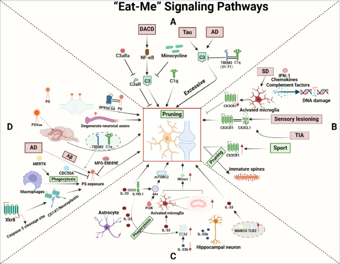 The biochemical pathways underlying synaptic pruning are quite complex. Part of that is because programmed synaptic death is related to programmed cell death (apoptosis). Some of the same underlying mechanisms are at work. One recent model postulates that individual synapses send out signals when they reach certain states. Xing et al 2025 characterize these as "eat me" and "don't eat me" signals, as shown.