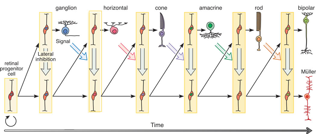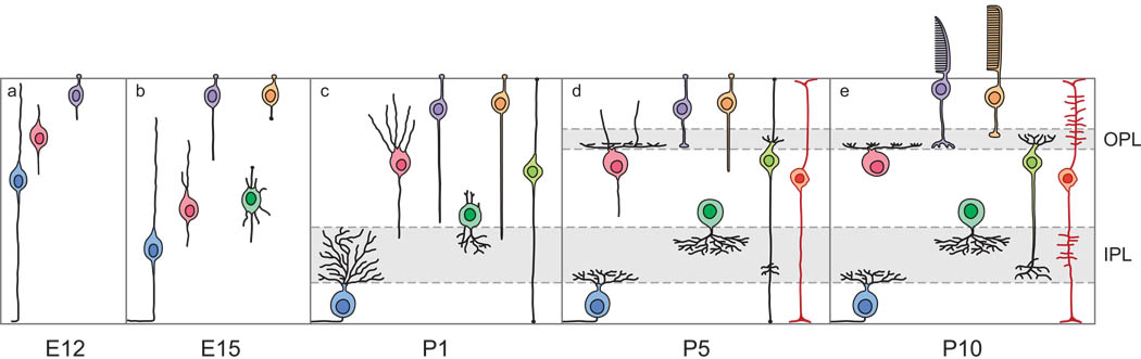 Ganglion cells are the first to form in the fetal retina. The sequence of neural development is fascinating in the sense that its dependencies aren't immediately obvious. The order of retinal neuron development and connection stratification is shown in the figures. Note the retraction of the basal horizontal cell process.