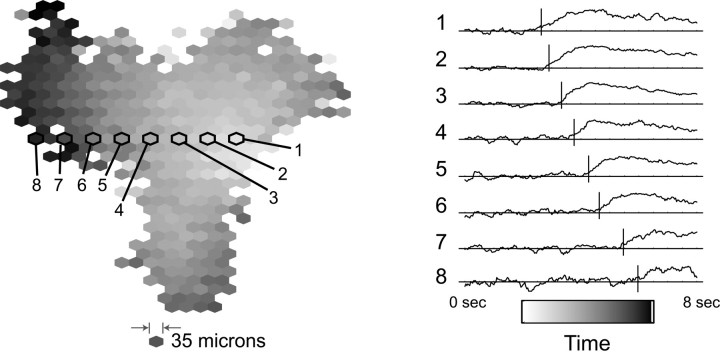 One of the first things that happens in human visual development is that starburst amacrine cells start generating waves of oscillations in the retina. T2 amacrine cells are also involved in this process. The waves begin in the periphery of the retina and travel centrally towards the fovea. Such waves are in alignment with the "optic flow" that the organism will eventually experience when it's moving forward. The retinal waves are transmitted to the LGN and the superior colliculus by retinal ganglion cells, where they help align the connections to propertly map the visual field. The wave-like activity from the retina continues through adulthood, contributing to things like the retinal shift effect, which is also thought to be mediated by starburst and T2 amacrine cells. The starburst cells are cholinergic and excitatory, whereas the T2 cells use GABA and begin as excitatory but eventually become inhibitory when visual input starts arriving. The figure shows the time course of a retinal wave, visualized over 2 mm2 using calcium imaging.