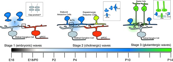 The wave-like activity in the amacrine cells generates waves of bursting in the retinal ganglion cells. As the wave propagates across the retina, neighboring ganglion cells start bursting in order. This activity contributes to the development of direction-sensitive ganglion cells, which can send axons to the superior colliculus or the LGN or both. The wave-like activity in the retina occurs in three phases during development. First there are infrequent bursts of patterned activity that appear embryonically and are likely mediated by gap junctions. In the second phase the cholinergic starburst amacrine cells become active, and this phase begins before the eyes open and continues through initial visual exposure. In the third phase there is ganglion cell bursting driven by glutamatergic bipolar cells, and it's due at least in part to an important mechanism called "glutamate spillover" which we'll revisit when we talk about the computational properties of dendritic spines.