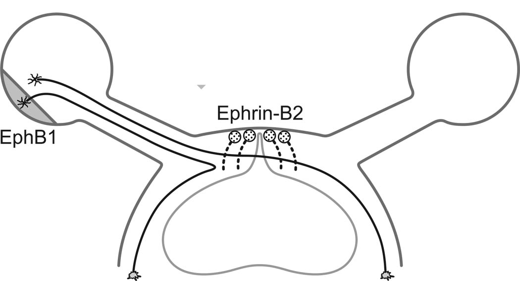 We've already discussed the important of genetic markers, in determing the axes of the retina. There are two important markers that determine the horizontal and vertical axes respectively, and one that specifies the center of the fovea. In addition there is the radius of the fovea and the location of the optic nerve, which are all determined before the first exposure to light. When the retino-geniculate pathway forms, the optic chiasm is an important choice point for retinal axons, and the direction they travel is influenced by transcription factors within the axons themselves, that identify the type of source cell they're from. Therefore the gradients that determine retinal orientation are somehow preserved in the ganglion cells, and influence subsequent connectivity. Proteins called ephrins are involved (mainly in retinotopic mapping), as are members of the teneurin adhesion family (which are involved in eye-specific mapping).