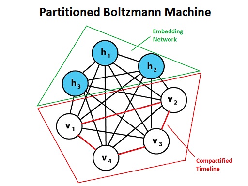 For another even simpler version, we can return to the stylized Boltzmann machine shown earlier. In this example we partition an omniconnected nerve net to achieve a low resolution embedding. However as distinct from the more sophisticated example above, this one does not necessarily have a higher resolution in the embedding network, and thus it has limited utility for our purposes.