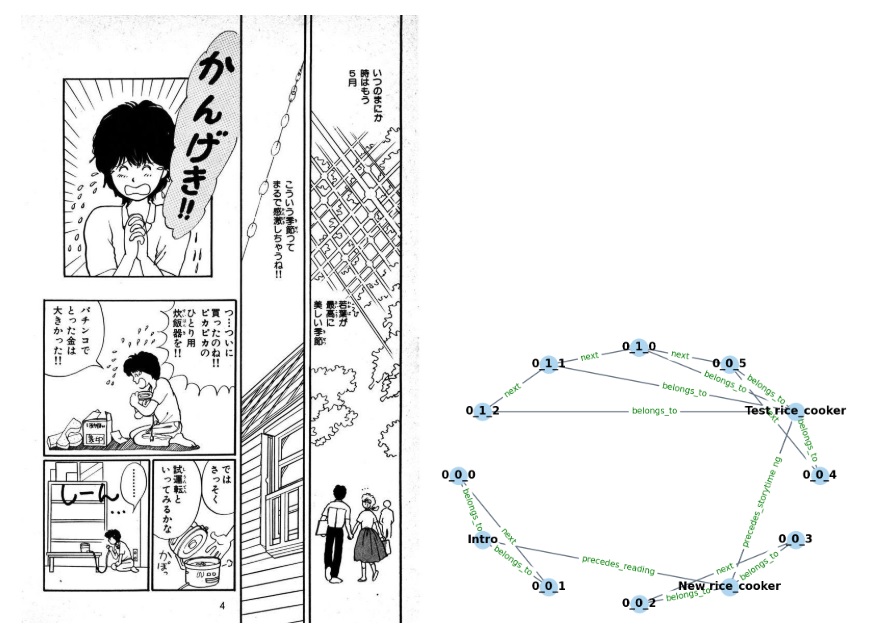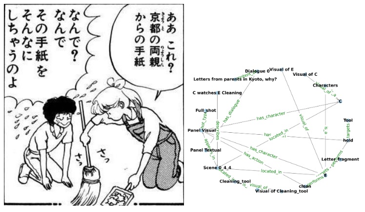 Why use graphs? Isn't object recognition enough? Well... graphs represent much more than just simple object relationships. For example, a graph can be used to represent physical relationships. A cup can be balanced precariously on the edge of a table, or a running dog can temporarily disappear behind a tree. Graphs represent physical scene understanding. Scene graphs are an important area of current research in machine learning. Scene graphs represent complex relationships hierarchically and topologically, enabling structured reasoning in addition to simple object detection and mapping. Hierarchical knowledge graphs are important for the understanding of "stories", which are like unfolding visual scenes (Chen 2025). The figure shows the translation of a visual scene into a knowledge graph. Look familiar?