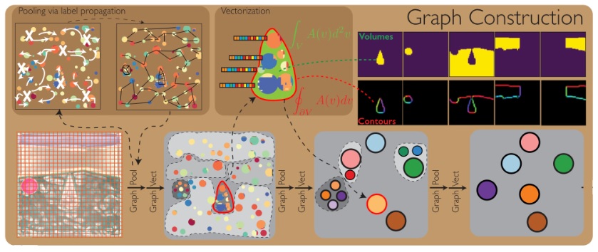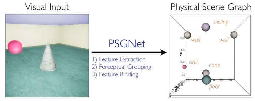 The primitives labeling the edges of the graph include things that can be phase encoded, like the relationship "precedes", and the relationship "next". Other relationships may not be directly derivable from the visual scene, and instead must be pulled from memory as "context" (this might include the primitive labeled "belongs_to" in the graph). The figure below shows a simple machine learning model of graph building from a visual scene. First the relationships are represented, which in the visual system depends on the extraction of retinotopic features, the perceptual grouping of visual elements into objects, and the binding of features to objects.