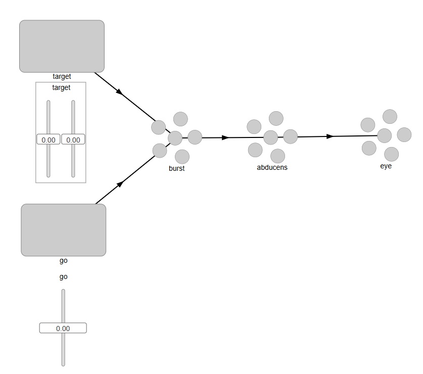 As you can see, the "Go" neuron is defined to be inhibitory, so in this network it will be more like a Pause neuron than a Go neuron. This arrangement makes gating a little easier, because it's "release from inhibition", and actually this is probably closer to the way the biological system works (OPN neurons are tonically active and they only release the eye movement when they stop firing).