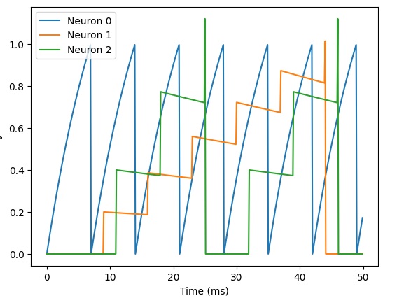G = NeuronGroup(3, eqs, threshold='v>1', reset='v = 0', method='exact')