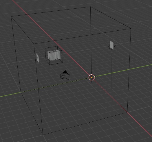 Python's matplotlib isn't the world's greatest presentation tool though (and we're trying to use it for something it wasn't really designed for), and besides, the retina is curved and all we have is flat sheets of neurons. What can we do with this? Well, one thing we can do is export this entire structure into a graphics program, like for instance Blender. Annie will generate OBJ files that are compatible with all of the popular graphics and animation programs, including Blender and Maya. OBJ files are defined in terms of "meshes", so in our case, each individual object we have defined will become a mesh, and its vertices and faces can be moved, transformed, shaped, and filtered to acquire whatever geometry we wish. Once we're done with the graphics engine, we simply export the results as an OBJ and read it back into Annie. Here for example, is the network we just created, in Blender. Note that Blender's Y and Z axes are reversed with respect to ours, so inside Blender, our vertical pedestal has acquired a horizontal orientation.