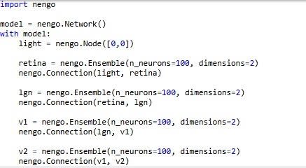 In Nengo's model, light is a "node", which is different from a neuron. So here, we don't have to create "virtual nuclei" to define things like stimuli and the exit paths of axons. It's nice to see stimuli differentiated from neurons on the screen, Nengo's presentation is intuitive that way. We can verify the topography by moving the two sliders, which represent the X and Y coordinates of the spot of light on the retina. This is the code that generates the network.