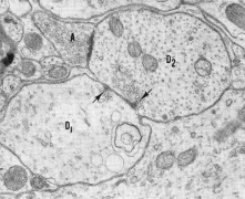 Synapses modify the neuronal membrane potential. The strength and time course of synaptic influence, together with the internal membrane properties of the neuron, ultimately determine the "spike times" of action potentials. Some neurons don't use action potentials, instead they transmit graded responses along their membranes, but these neurons can still be influenced synaptically. The word "synapse" in a general sense is meant to include all forms of local connectivity, for example gap junctions, but historically it refers specifically to a vesicular form of transmission.Vesicular TransmissionThe classic synapse is unidirectional, from an axon terminal to the dendrite of another neuron. The presynaptic axon terminal is filled with vesicles containing neurotransmitter, which diffuse across the synaptic cleft to interact with receptors on the postsynaptic side. Synapses can be made anywhere, on the dendrites, on the cell body, even on other axons. There are many specialized kinds of synapses in a human brain, for instance the glomeruli in the cerebellum. The first figure below stylizes an oversimplified "typical" synapse, showing the release of neurotransmitter from synaptic vesicles. The second figure shows the fusion of transmitter-loaded vesicles with the axon terminal, and the expulsion of neurotransmitter into the synaptic cleft. Fusion of vesicles with the presynaptic membrane depends on calcium, which enters the axon terminal during an action potential. When calcium enters the synapse, it causes the vesicles to fuse with the presynaptic membrane, releasing their contents into the synaptic cleft, which is a tiny gap between the pre- and post-synaptic membranes maintained by specific protein scaffolding. After release from the vesicles, the neurotransmitter diffuses across the cleft and binds with receptors on the postsynaptic side. After it's done binding, it can be either degraded or recycled (and either process may involve active reuptake, into neurons and/or glial cells - the reuptake is accomplished by specialized proteins called "transporters").![]() ![]() Neurotransmitter filled vesicles are synthesized and packaged in the cell body, and transmitted down the axon to the synaptic terminals by a network of microtubules related to the cytoskeleton. This process is regulated, it can be sped up or slowed down according to demand. There is both anterograde transport and retrograde transport, used vesicles are transported back to the cell body where they can be refilled. In conditions of changing demand, the quantal transmission hypothesis specifies that the amount of neurotransmitter per vesicle remains relatively constant, but the number of available vesicles can change. In the figure below MTOC is a microtubule organizing center.![]() The totality of the synapses emanating from a neuron may be quite diverse. Some neurons use more than one transmitter. The axons branch and send collaterals all over the brain, and in some areas the receptors may be different and have unique postsynaptic effects. However in most neurons, the branching patterns are very specific, and in some cases very local. In the cerebral cortex for example, the axons of lower layer cells may turn upward and branch to synapse within a narrow cylinder about equivalent in width to a mini-column. ![]() ![]() ![]() Spiny synapses are ubiquitous in the human brain. Here they are in the hippocampus and cerebral cortex, and they occur as well in the basal ganglia and cerebellum and many other subcortical structures.![]() ![]() The synaptic spines are important for many reasons. One of the most important is isolation, which is necessary for synapses to be updated independently. Another reason is that each patch of spiny membrane can sustain independent subthreshold membrane oscillations. In effect, each spine can become its own oscillator, coupled to others by conductances along the membrane, but only weakly and controllably coupled because of the high impedance of the spine stalk and its biochemical compartmentation relative to the rest of the dendrite. We will revisit this scenario in more detail later, when we talk about the behavior of coupled oscillators. Below is the bursting behavior of a pyramidal neuron in the cerebral cortex, elicited by applying glutamate to the basal dendritic tree. You can see the small subthreshold membrane oscillations that occur even in the down state. These are often related to membrane resonances which in turn depend on the conductances and are therefore synaptically modifiable. Changes in the membrane time constant are one way to control the interval between spikes.![]() Synaptic activity results in excitatory and inhibitory postsynaptic currents. The time course of such currents could be anywhere from a millisecond to a second or more, depending on the kinetics of the underlying neurotransmission. There is typically a small delay associated with synaptic transmission, perhaps on the order of a millisecond or so. ![]() The effect of incoming EPSP's may change when the postsynaptic membrane is driven into a more excitable state. This is especially true for multistable neurons that have a judicious combination of conductances that allow them to maintain multiple resting potentials depending on the time course of activity. For instance there are "plateau potentials" that are larger than ordinary EPSP's, and these are thought to be created by calcium conductances in the dendrites. The plateau potentials can put the neuron cell body into a different resting state, where it responds differently to incoming synaptic signals. Below are some of the plateau potentials related to dendritic spiking activity in neostriatal medium spiny cells. The plateau potentials typically result in bursts of spiking. They are compared with ordinary EPSPs that may result in one or a few spikes. Plateau potentials are different from dendritic spikes. They represent a stable equilibrium state of the neuronal membrane,