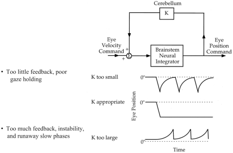 Overview of Oculomotor SystemIn this section we'll review human eye movements and outline the behavior of the eyes for each movement type, along with providing some context for the subsequent sections where we'll discuss targeting and attention. ![]() ![]() Here is the corroboration of these pathways from the standpoint of functional MRI. The images start at the top left in the brainstem, and proceed to the rostral surface of the brain. On the top left you can see the abducens nucleus, one of the most important oculomotor nuclei in the brainstem that directly drives the lateral rectus muscle. On the top right is the superior colliculus, an important structure for target selection. On the bottom row are the parietal and frontal eye fields, and the supplementary eye fields in the premotor area. The cingulate eye field is shown in light blue in the middle row on the right.![]() To understand this architecture, we'll work bottom up. We'll start with the eyes and the eye muscles, and work our way up to the cerebral cortex. The organization of the oculomotor system is most logical when understood this way.Eyes and Eye MusclesThere are six main muscles that move the eye in its socket, and several others related to the eyelid, pupil, and lens. Eye movements along the horizontal and vertical axes are organized by the rectus muscles, which are arranged into push-pull pairs. Each muscle maintains a low level of tonic activity even during fixation, to keep the eye stable and avoid drift. The figure below shows the organization of the muscles in the right and left eyes. ![]() ![]() The eyes can move together, conjugate from side to side, or they can move disjunctively, for example when focusing in depth. These systems are mostly separate in the brain, for example there is a separate system for vergence (disjunctive) movements. However they come together at the level of the oculomotor neurons. As you can see from the figures at the top of the page, the circuitry of the oculomotor system is somewhat complex, and the insertions of the eye muscles are not necessarily conveniently aligned along Cartesian axes. However the overall architecture can be organized functionally, into subsystems and pathways that make sense. ![]() The range of eye movements is approximately aligned with the "immediate field of view", as shown in the figure. Targets outside of this range tend to evoke more complicated orienting movements involving the head and body. Some of these movements are organized by the superior colliculus, and transmitted through descending fibers that target the cervical and spinal motor pathways. There are other pathways through the cerebellum, involved with gaze maintenance and the precision of fixation. These systems are complex and interact with each other at many levels. For example the vestibulo-ocular reflex has to be compensated during tracking movements that involve the head. Much of what we know about human eye movements comes from clinical conditions where either the range, velocity, or behavior of the eyes (or all of these) is altered.![]() Overview of Eye Muscle ControlAnatomically, much of the eye movement circuitry is organized at the level of the midbrain, in the pons and neighboring areas, close to the vestibular systems and close to the cerebellum. The pontine reticular formation is an intricate tangle of tiny nuclei and fibers going in all directions. It has taken many years of study, and the invention of some clever technology, to map this area of the brain. The basic circuitry around the abducens nucleus is shown in the figure. You can see the pathway that cross the midline and activates the oculomotor nucleus on the contralateral side, which contracts the contralateral medial rectus muscle and keeps the eyes in alignment. A lesion or tumor at position 4 will affect the movement of both eyes in the contralateral direction, whereas cutting the abducens nerve at position 1 affects only one eye - however the brain tries to compensate for oculomotor deficits, and the time course of adaptation is an important clinical indicator.![]() The eyes have "focus", both horizontally and vertically, and in depth. The horizontal and vertical foci are often conceived in terms of "gaze centers". When organized this way, the horizontal gaze center is in the paramedian pontine reticular formation (PPRF), and the vertical gaze center is in the rostral interstitial nucleus of the medial longitudinal fasciculus (riMLF). As you can see in the figure, horizontal saccades are primarily driven by the lateral rectus muscle on the abducting side, and its accompanying neural circuitry. The PPRF contains bursting neurons that drive the motor neurons in the abducens nucleus during saccades. Both of these areas get direct input from the cerebral cortex and the cerebellum. As a general rule, the firing rate of abducens motor neurons is directly related to eye position, whereas the bursting neurons convey velocity signals, that need to be integrated to translate them into eye positions.![]() Vertical saccades use a separate set of pathways that control the superior and inferior rectus muscles via the oculomotor nucleus, whose axons travel through cranial nerve 3. Because of the way the eyes are arranged in the orbit, vertical eye movements also generate small amounts of torsion, and to correct this the superior and inferior oblique muscles get involved too. The superior oblique has its own pathway through the trochlear nucleus and the trochlear nerve (cranial nerve 4), whereas the inferior oblique uses the oculomotor nucleus and CN-3. When the eyes are at rest, the tension on each muscle is minimal and so is the firing of the motor neurons that drive the muscles. Whenever the eyes deviate in any direction, they tend to eventually slip back into their resting positions. To maintain them in an eccentric position, the motor neurons have to keep firing, and that is part of what "gaze" is, it's a careful adjustment of moto