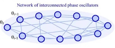 The Kuramoto model describes the behavior of coupled oscillators. In this diagram, each node could be an oscillator consisting of a small number of neurons connected into a simple oscillatory motif (for example in accordance with the Wilson-Cowan model). Coupling between nodes is accomplished by the (synaptic) connections between them.