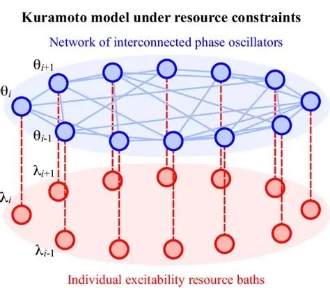 There are extensions of the Kuramoto model, for example the specific case of a bimodal frequency distribution has been solved exactly, for Lorentzian and Gaussian distributions. However the general case leads to a complex set of coupled differential equations that would be impossible to solve in real time with current technology. So we look for other avenues to approach questions like criticality, and one of the very promising avenues is nonlinear thermodynamics, which can be directly applied to neural networks with quantum computing. The complexity of Kuramoto dynamics is shown in the figures.