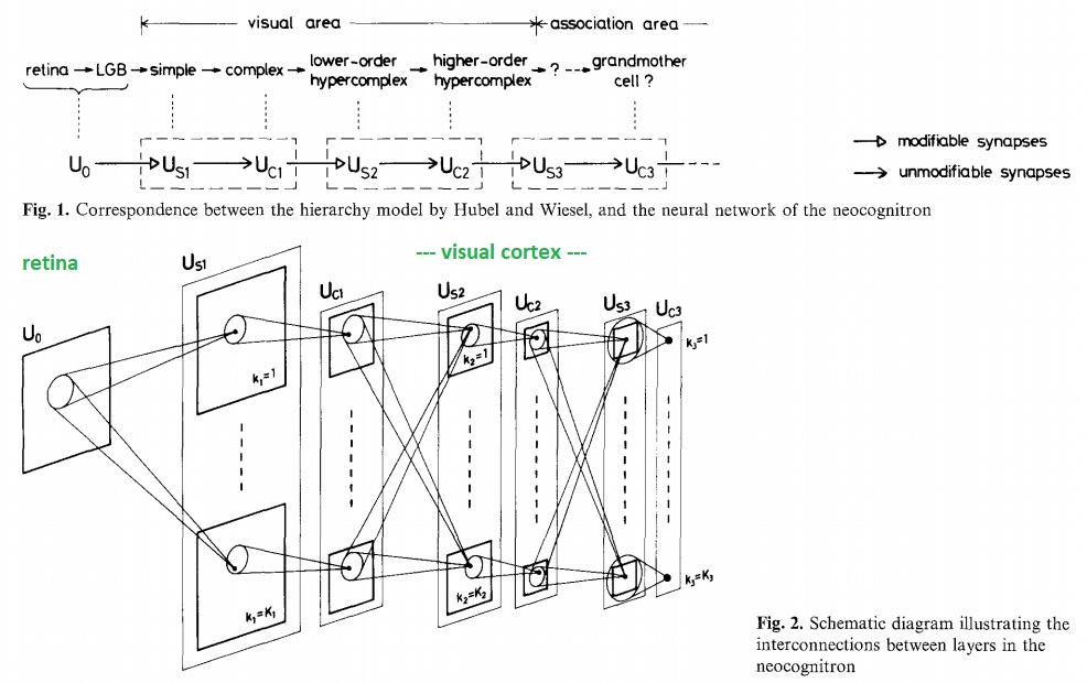 These are called "convolutional" neural networks. They are not new. They arose out of pioneering work by Kunihiko Fukushima in the 70's and 80's, in his capacity as a research scientist at NHK in Japan. Fukushima's "Neo-Cognitron" was the first translation-invariant convolutional network. His original network model is shown below.