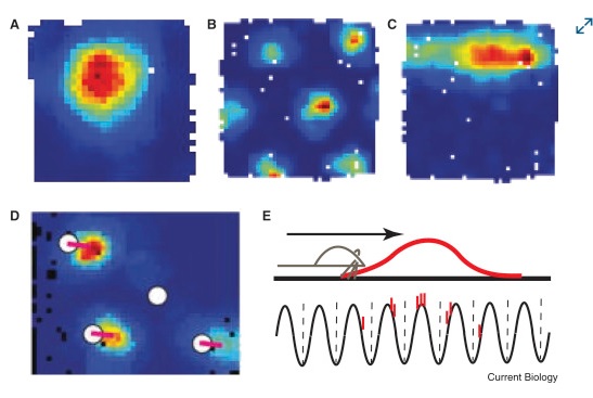 Visualizations of the scene mapping behavior in the hippocampus can be quite revealing. Here for example are the receptive fields of place cells in the hippocampus (a) and grid cells in the entorhinal cortex (b). The mechanism of phase encoding is shown in (e). The red portion is the receptive field of a place cell, and the bottom part shows its output after phase encoding against the theta rhythm. The result of phase encoding is that the position of the organism in allocentric space comes to be represented by the position of the spikes in a spike train. Thus as the organism navigates, a snapshot of the spike trains represents (and reveals) where the organism is at any given time.