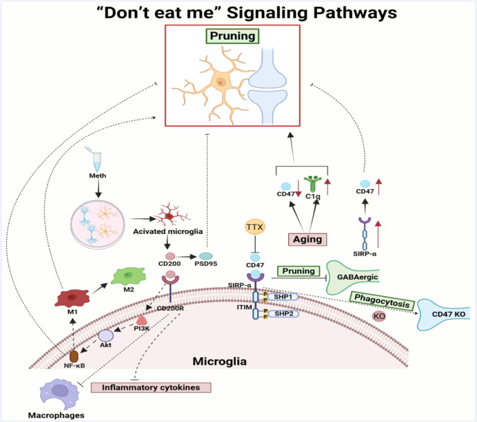 The biochemical pathways underlying synaptic pruning are quite complex. Part of that is because programmed synaptic death is related to programmed cell death (apoptosis). Some of the same underlying mechanisms are at work. One recent model postulates that individual synapses send out signals when they reach certain states. Xing et al 2025 characterize these as "eat me" and "don't eat me" signals, as shown.