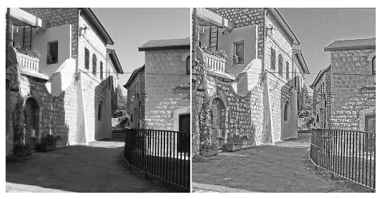Adaptive Gain ControlFor the visual system to develop properly, the retina has to perform certain important functions so the signals that drive upstream synaptic formation are present when they're needed. One of the most important retinal functions is adaptive gain control. The retina works on contrast, the ganglion cells signal the differences between the centers and the surrounds. The range of contrast can change dramatically in bright light versus low light, and the rest of the visual system doesn't care (much) about the light level (except for the pupillary reflex and etc), all it really cares about is edges and contours and boundaries that define surfaces, so the retina helps the upstream systems extract this information by providing a consistent contrast range so features can be easily detected. The figure shows an example of gain control on a sunny day. The gain-controlled image is on the left, the original image is on the right.